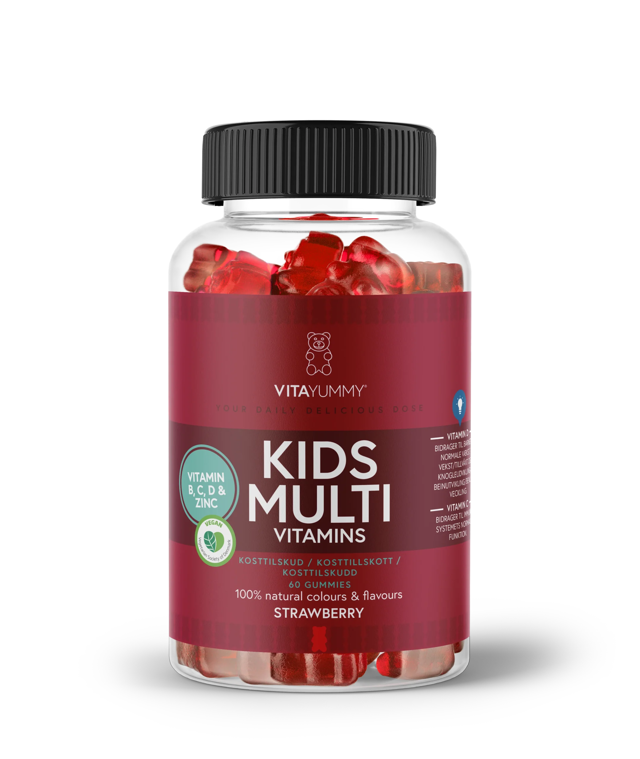 Šie skanūs braškių skonio guminukai skirti vaikų sveikatai ir stipriai imuninei sistemai palaikyti. Multivitaminų sudėtyje yra būtiniausių vitaminų ir mineralų, reikalingų sveikam vaiko augimui ir kasdieniams organizmo poreikiams.